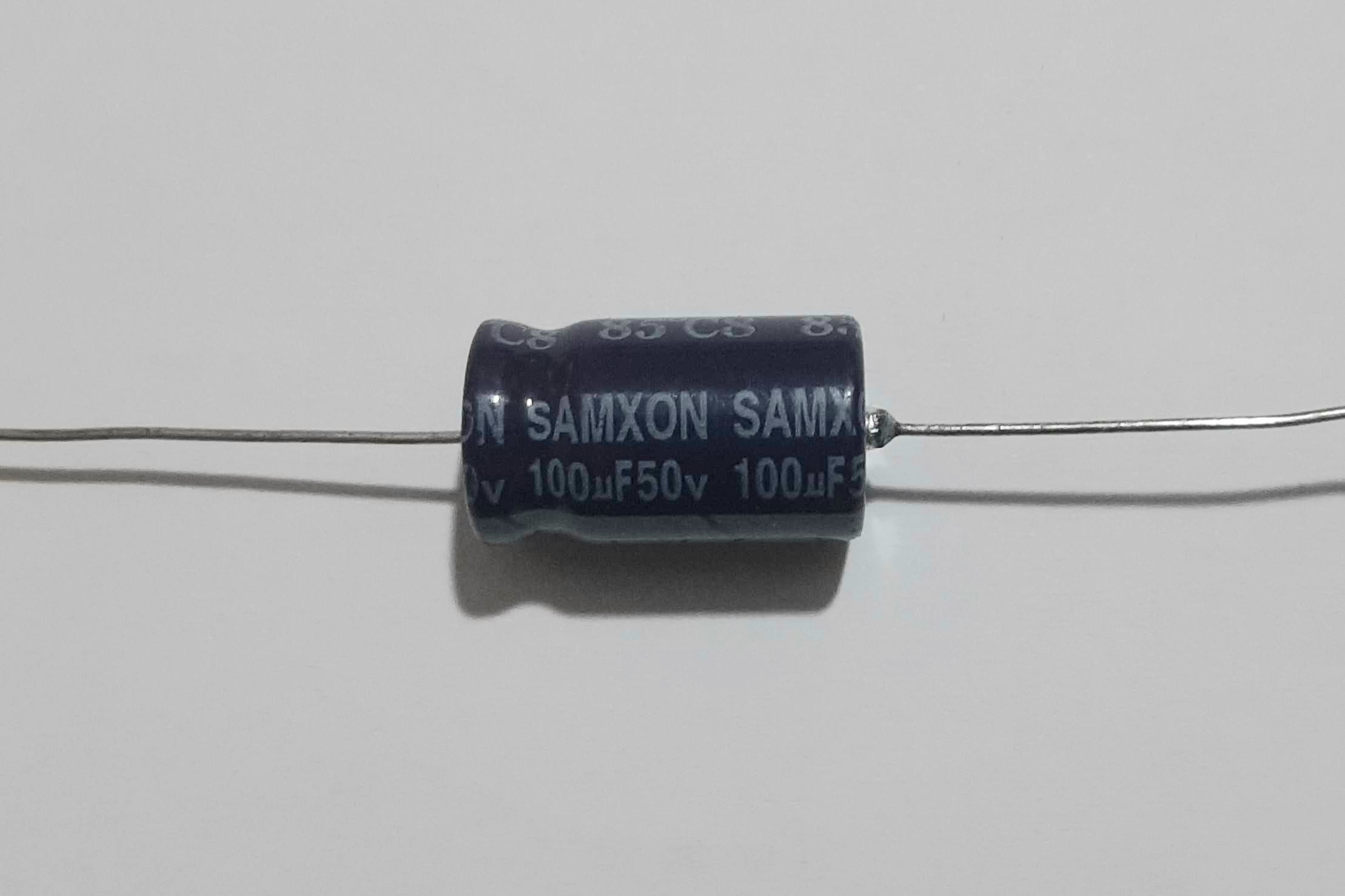 Axial 50V 100uF – خازن اکسیال، ۵۰ ولت، ۱۰۰ میکروفارادSAMXON
